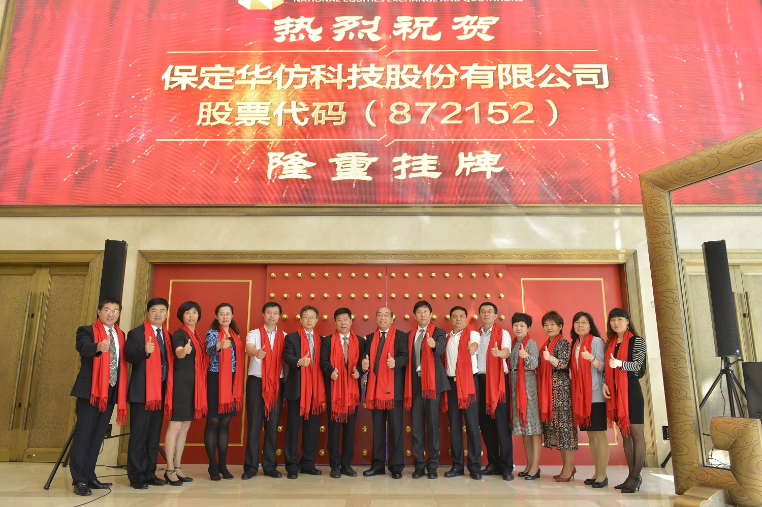 2017年9月21日,保定华仿科技股份有限公司(以下简称华仿科技)在全国中小企业股份转让系统有限公司(北京)成功举行挂牌敲钟仪式(股票代码:872152)。华仿科技董事长马士英,华北电力大学副校长孙忠权,华仿科技大股东代表——资产公司执行董事兼总经理金海燕以及保定市相关领导,中介机构负责人共同出席了此次活动。