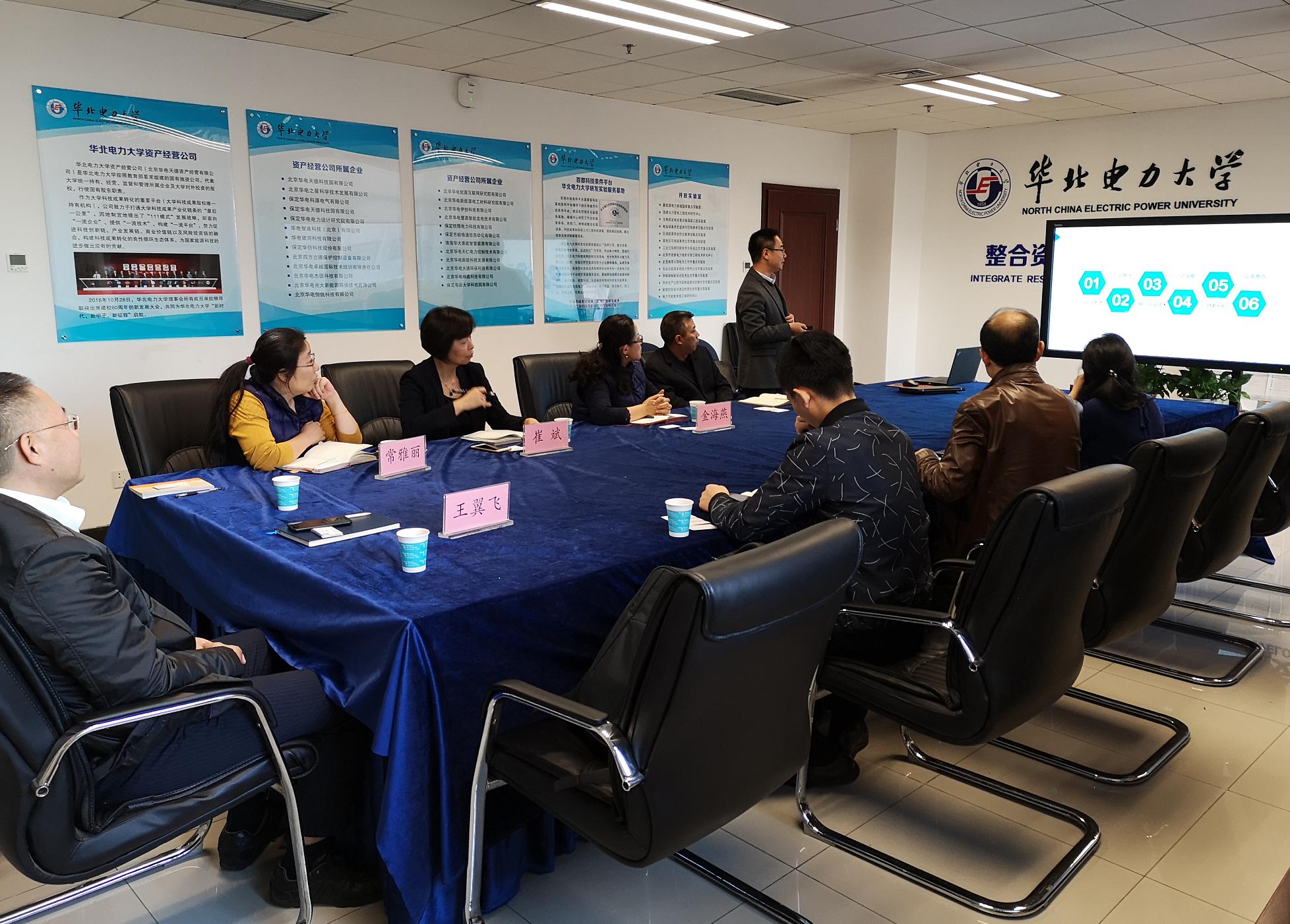 2019年10月24日,北京科创基金子基金、比目鱼(北京)企业咨询有限公司等一行来我校资产公司,就校科技成果转化合作开展项目对接交流活动。华北电力大学资产公司总经理金海燕、副总经理常雅丽、总经理助理胡鹤龄、企业风控总监崔斌等出席会议。