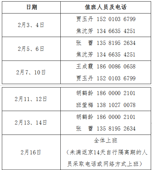 当前,新型冠状病毒感染的肺炎疫情防控形势严峻,根据北京市和学校相关文件要求,结合目前的实际情况,现将2月3—16日值班情况通知如下(2月3日之前按照原春节期间值班安排进行):