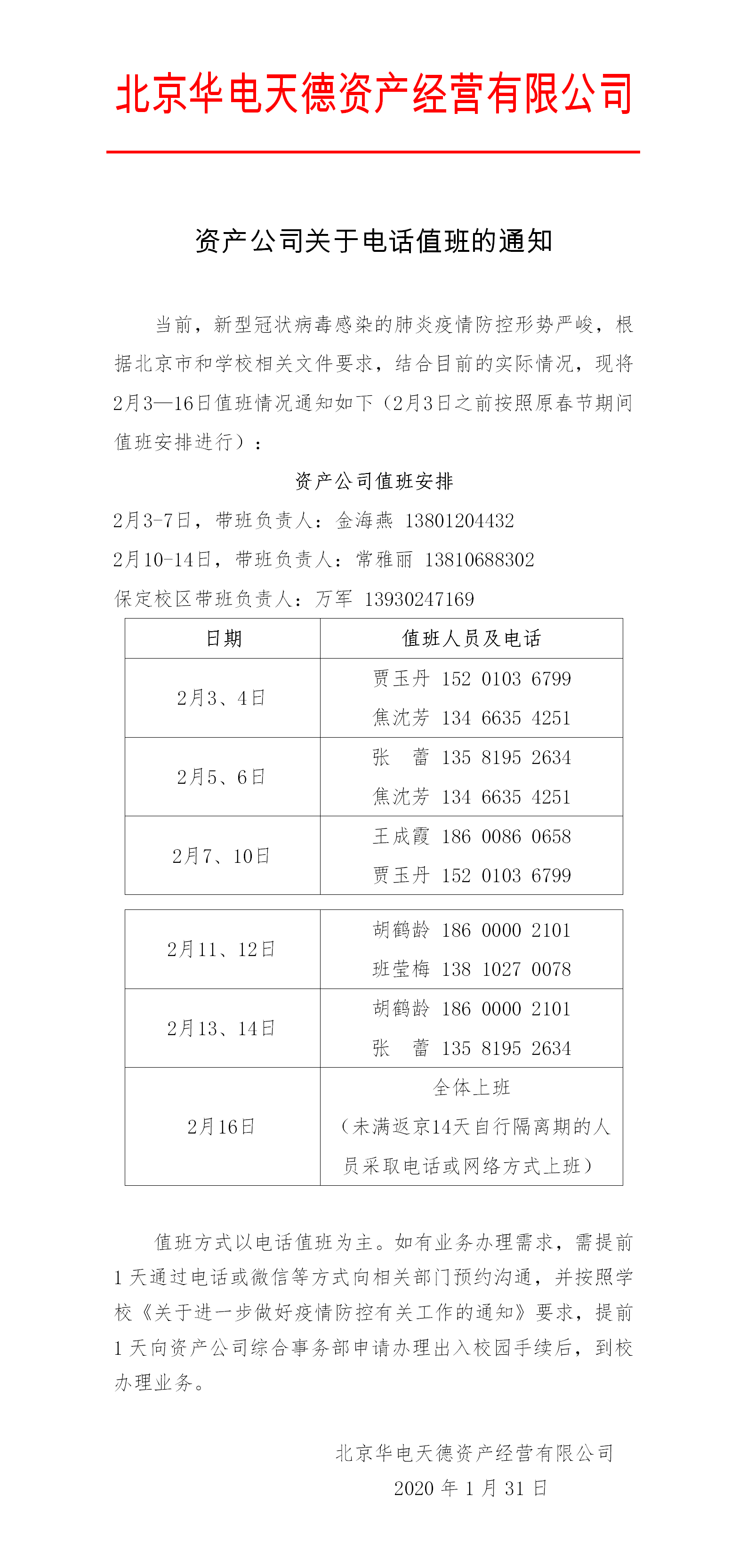 值班方式以电话值班为主。如有业务办理需求,需提前1天通过电话或微信等方式向相关部门预约沟通,并按照学校《关于进一步做好疫情防控有关工作的通知》要求,提前1天向资产公司综合事务部申请办理出入校园手续后,到校办理业务。