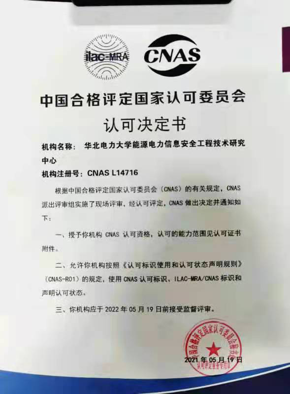 5月19日,中国合格评定国家认可委员会向华北电力大学能源电力信息安全工程技术研究中心(以下简称实验室)颁发实验室认可证书。根据中国合格评定国家认可委员会(CNAS)的有关规定,CNAS派出评审组实施现场审核,授予该实验室CNAS认可资格,并允许该实验室按照《认可标识使用和认可状态声明规则》(CNAS-R01)的规定,使用CNAS认可标识,ILAC-MRA/CNAS标识和声明认可状态。 中国合格评定国家认可委员会(英文缩写为:CNAS)是根据《中华人民共和国认证认可条例》的规定,由国家认证认可监督管理委员会(英文缩写为:CNCA)批准成立并确定的认可机构,统一实施对认证机构、实验室和检验机构等相关机构的认可工作。于2006年3月31日正式成立,是在原中国认证机构国家认可委员会(英文缩写为:CNAB)和原中国实验室国家认可委员会(英文缩写为:CNAL)基础上整合而成。CNAS通过评价、监督合格评定机构(如认证机构、实验室、检查机构)的管理和活动,确认其是否有能力开展相应的合格评定活动(如认证、检测和校准、检查等)、确认其合格评定活动的权威性,发挥认可约束作用。