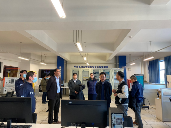 陈义学一行首先参观了华北电力大学信息安全实验室,深度了解了实验室举办的历届“全国工控系统信息安全攻防竞赛”平台、信息安全实训平台、智能变电站仿真系统、信息安全实验工具箱、工控场景模拟仿真系统、永磁调速器、阻止落雷的直击雷防护设备等技术和产品。
